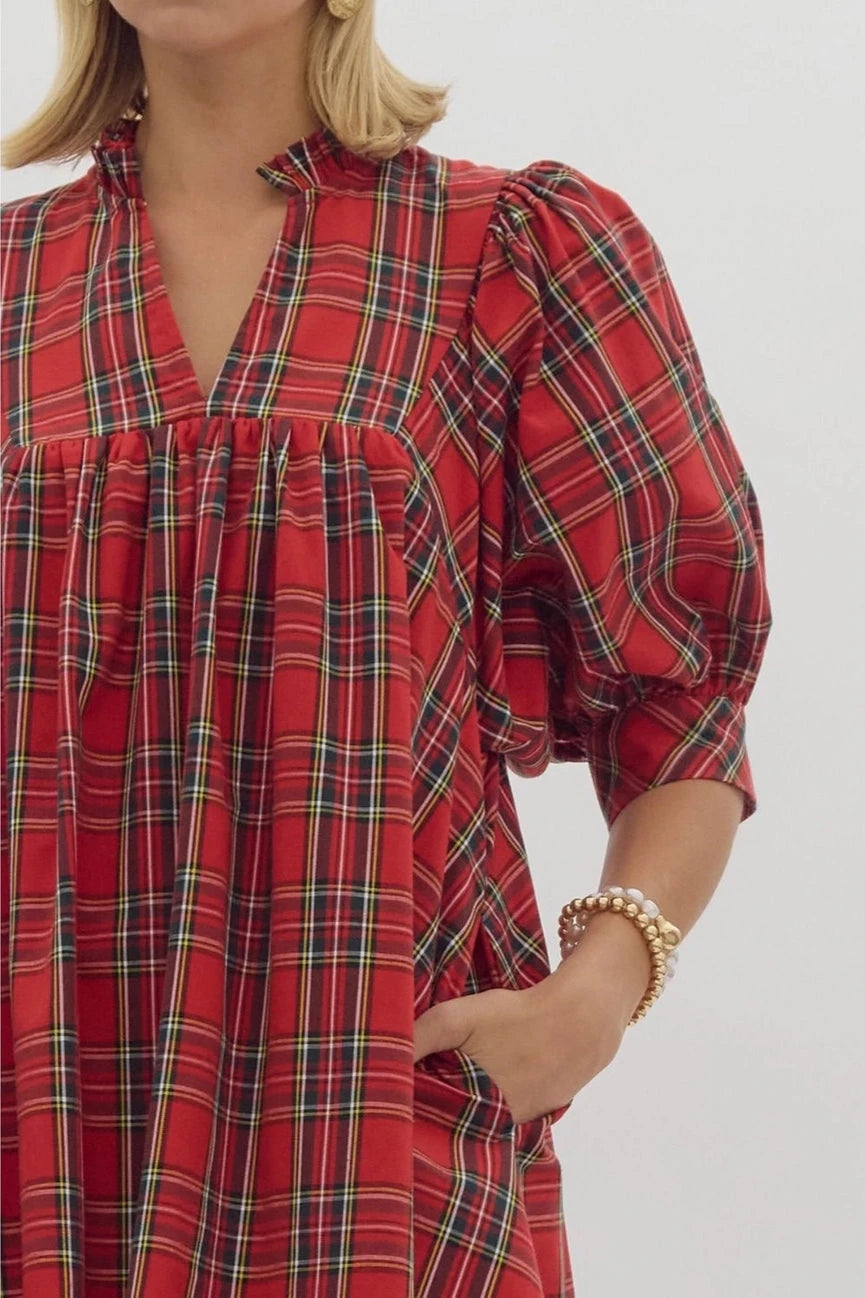 Step out in style this holiday season with the Bethenny Plaid V-Neck Puff Sleeve Mini Dress. Made with high quality fabric, this dress features a classic plaid pattern, a flattering v-neckline, and trendy puff sleeves. Perfect for any festive occasion, this dress will be your go-to holiday outfit.