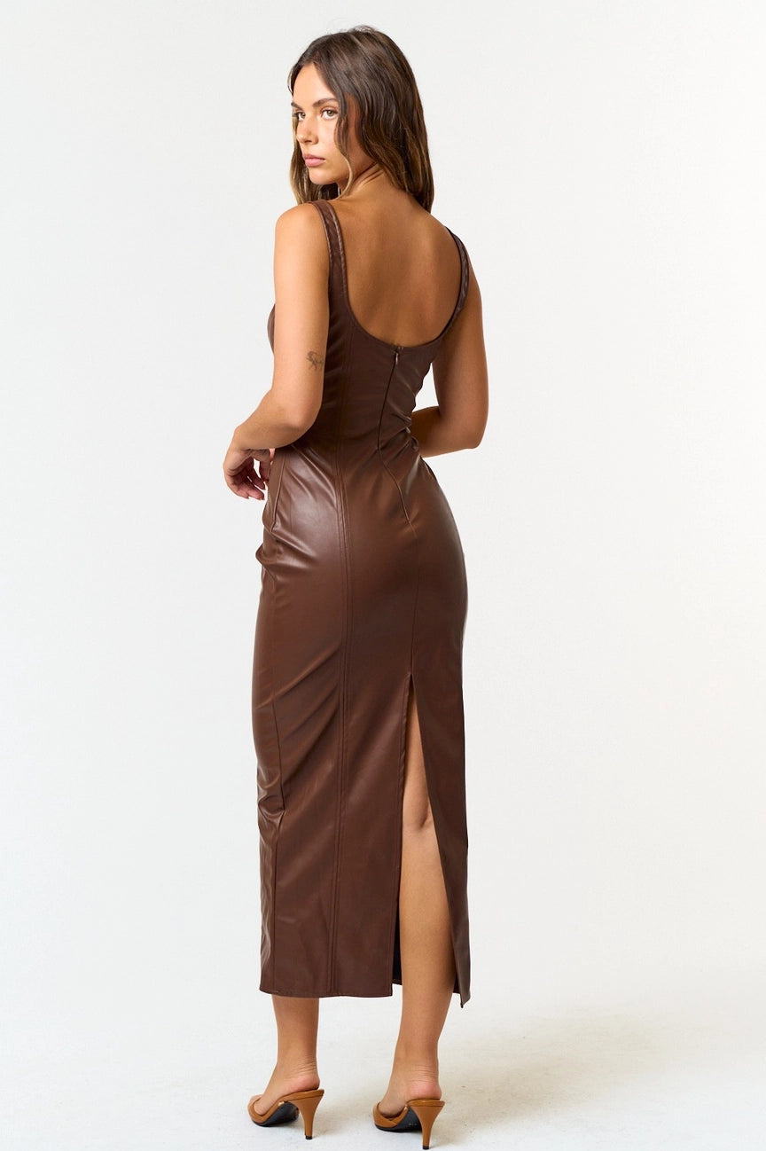 Indulge in the luxurious and elegant charm of our Riviera Romance Leather Dress. Crafted with high quality leather, this maxi dress boasts a sophisticated cut out square neck design that exudes both style and comfort. Perfect for any occasion, this dress delivers an impeccable combination of style and quality.