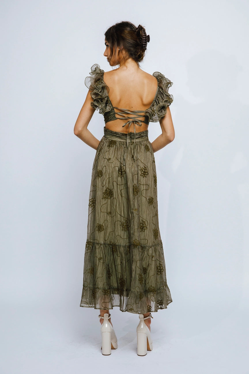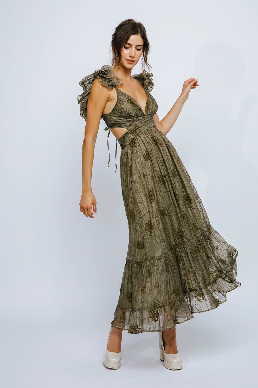 This Serena Monochromatic Embroidered Maxi Dress exudes elegance and sophistication. With its plunging neckline and fluttered ruffle straps, it adds a touch of romance to any occasion. The high quality embroidery and empire waist add to its stylish appeal. Perfect for fall, it is a must-have for date night.
