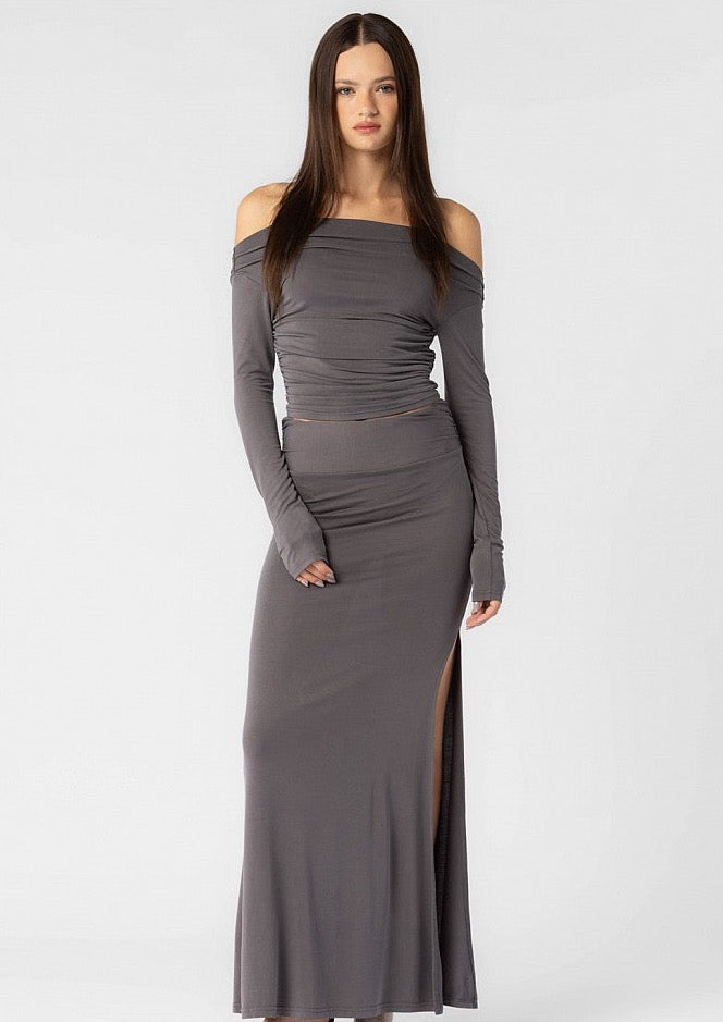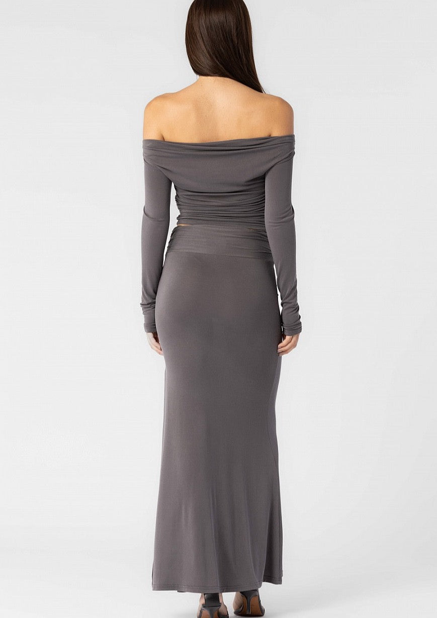 Introducing the Lifton Modal Knit Skirt - a must-have outfit for the fall season. Expertly crafted from modal knit fabric, this top and skirt set offers a sophisticated look and comfortable fit. With its off-the-shoulder style, this set is perfect for any special occasion. [SET SOLD SEPARATELY]