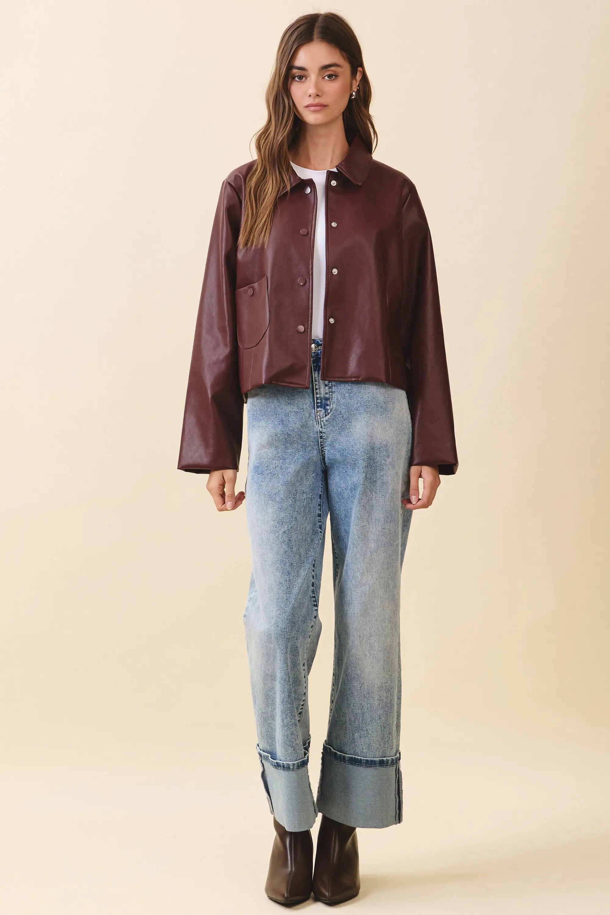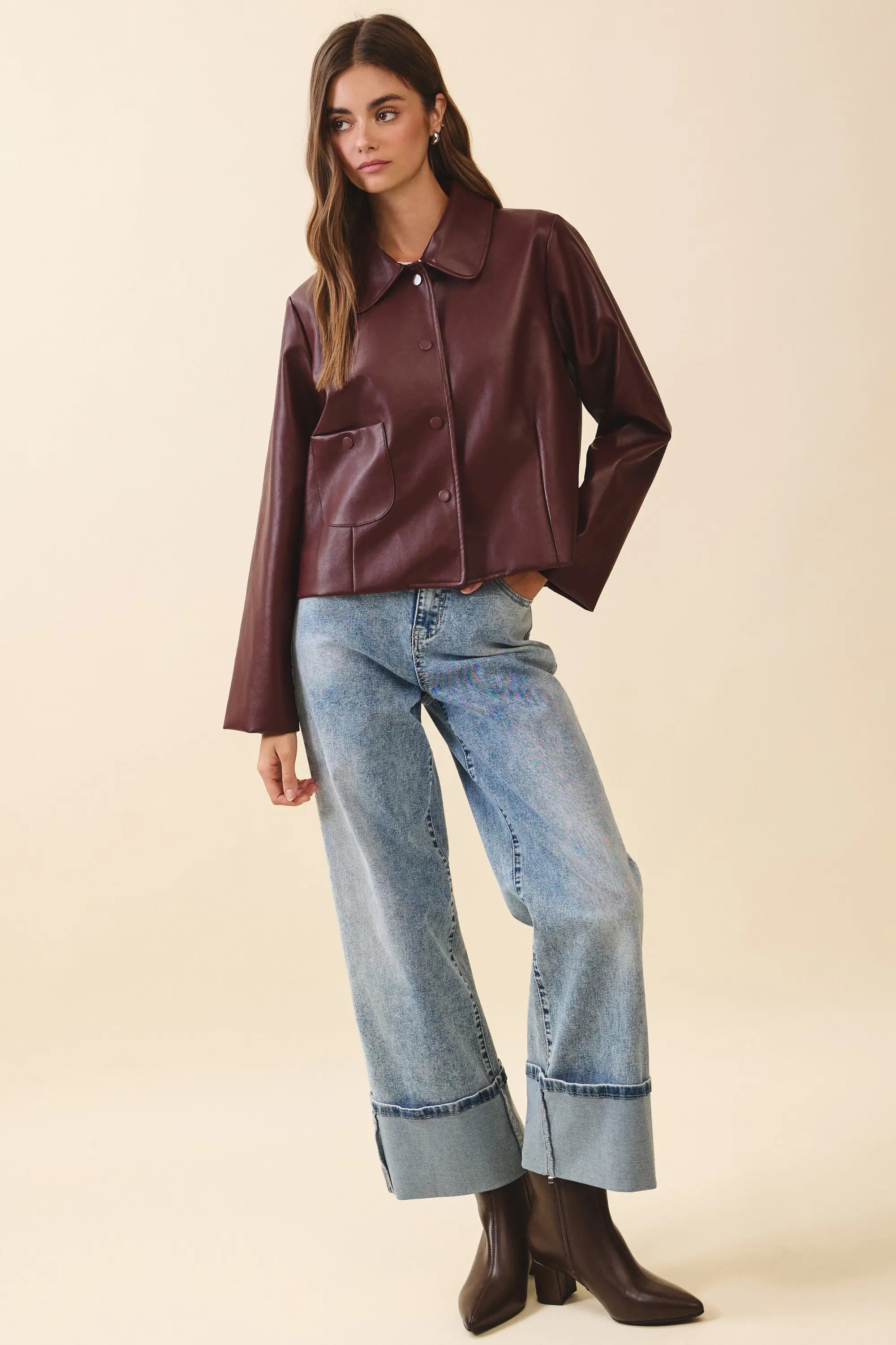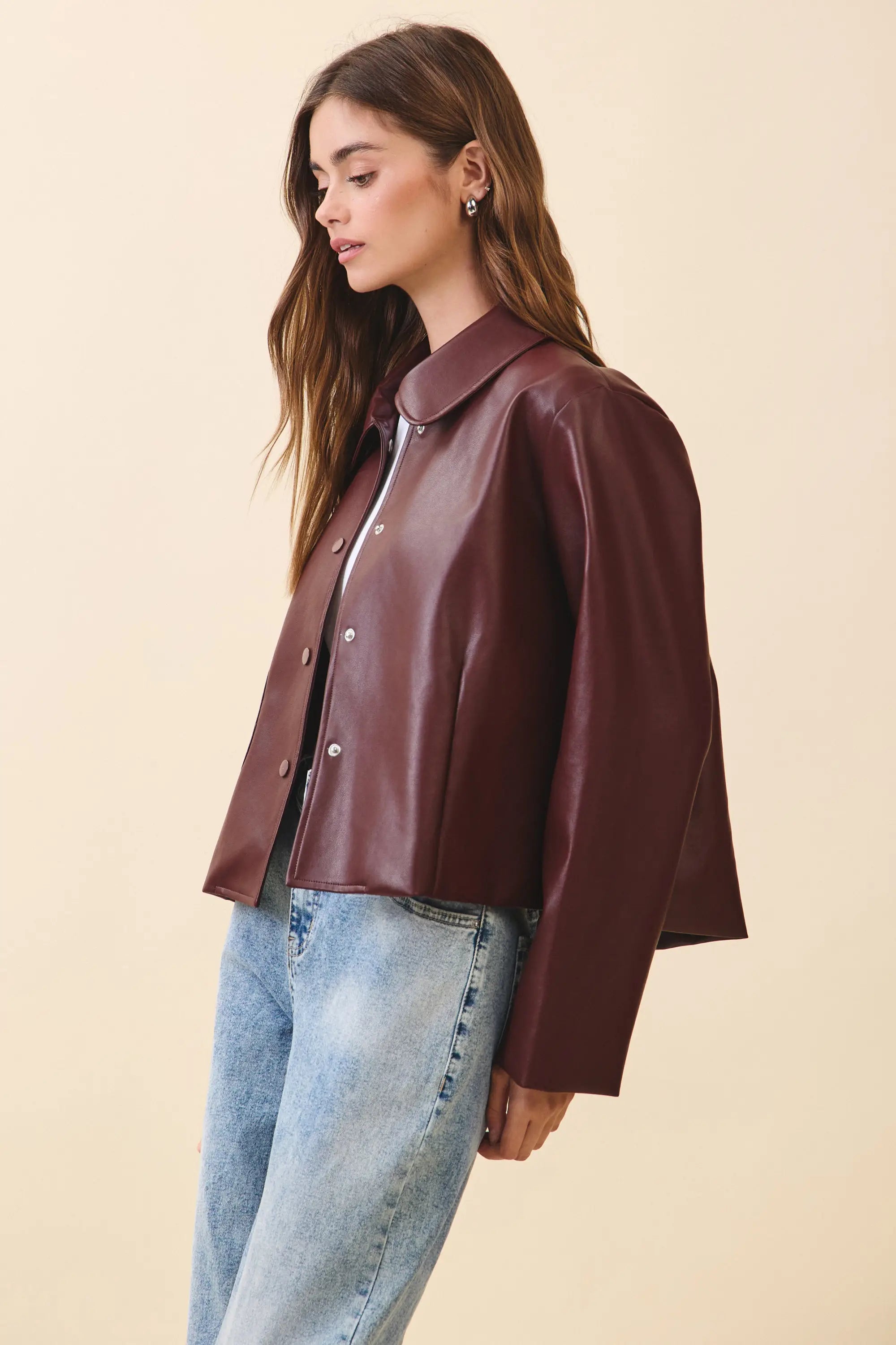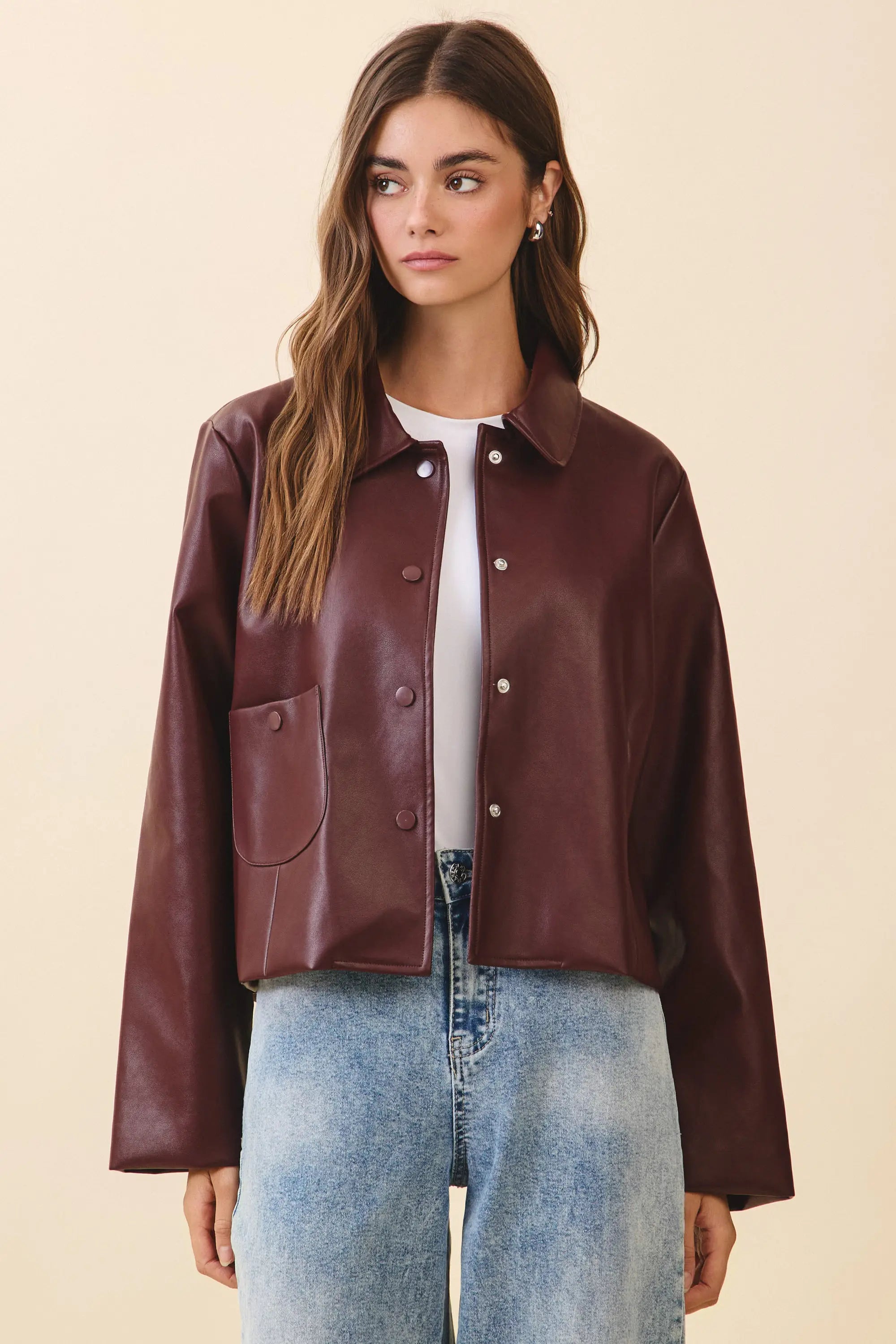 The Penelope Jacket exudes sophisticated style with its faux leather material, pointed collar, and snap-button closure. The statement patch pocket and gentle gathering at the back yoke add unique details, while the clean topstitching and long sleeves provide a polished finish. Elevate any outfit with this must-have jacket.
